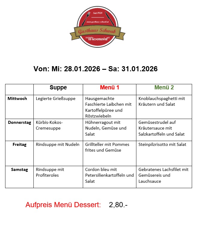Wir bieten unseren Gästen täglich ein frisch zubereitetes Mittagsmenü, zur Auswahl steht: